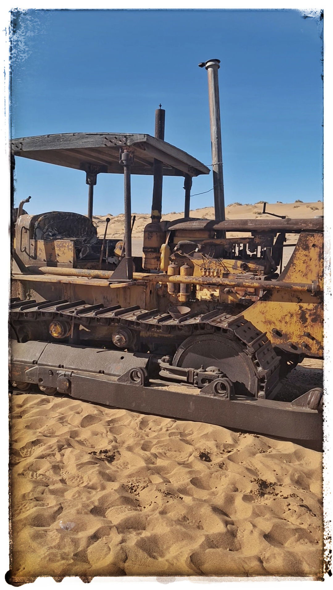 Quick stop at “Suzy”, Cool story, cool photo opportunity, and then we point east and must encounter very high dunes with deep holes to get to the bulldozer. The old Moshe Khan bulldozer, a real relic from the wild diamond mining days back in the early 1900s. Mining boss Moshe Khan (a tough-as-nails character who pioneered supplies to remote spots like Saddle Hill) used this beast to haul gear across the dunes. But one day it got bogged down for good, and there it sits, slowly rusting away as the desert claims it. It's a cool photo stop and a reminder of how brutal this place was for the old-timers.
